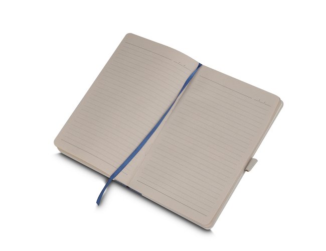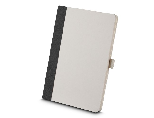 Caderno de anotações, Capa produzida/de fibra de cana de açucar e tecido RPET com suporte para caneta, miolo com 80 folhas pautadas na cor bege.