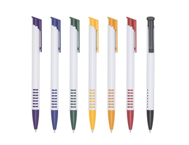 Caneta plástica com carga esferográfica azul e acionamento por clique.