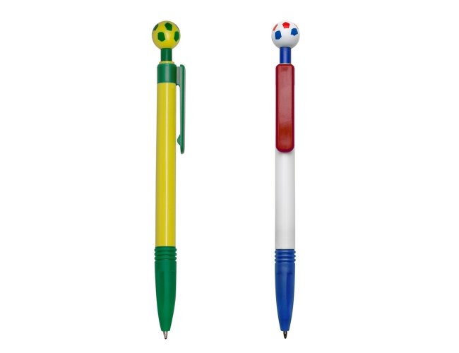Caneta plástica com acionador formato bola. Carga esferográfica azul 1.0mm e acionamento por clique.