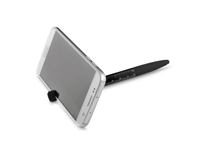 Caneta plástica multifunções colorida com detalhes em preto fosco. Clip com limpador de tela na parte superior, pode também ser utilizado como suporte de apoio para celular; removendo esta tampa superior há um suporte com uma mini chave de duas pontas(Fenda e Philips); corpo da caneta triangular com régua de 7 cm e borracha touch inferior. Aciona por giro.