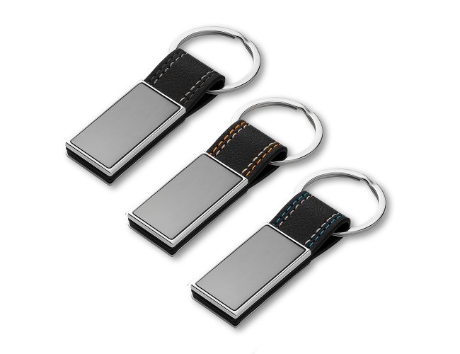 Chaveiro de metal em níquel brilhante + PU, acompanha caixa com berço aveludado.