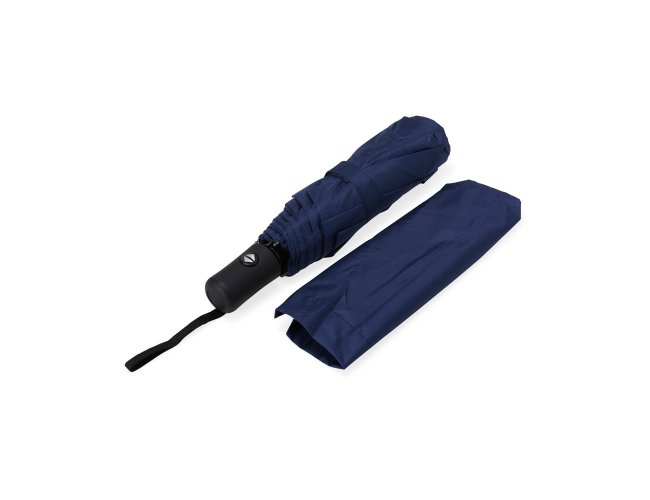 Guarda-chuva automático de nylon com impacto impermeável e proteção UV, tecido interno em vinil. Com estrutura em aço e 8 varetas em fibra de vidro, possui pegador plástico com botão de ação e alça de nylon. Acompanha capa protetora.