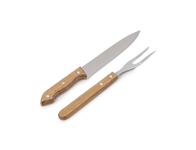 Kit Churrasco com 3 peças: Garfo, Faca com 31,7 cm, ambos com cabos de madeira e lâminas em aço inox, Tábua de bambu com 1,2 cm de espessura.