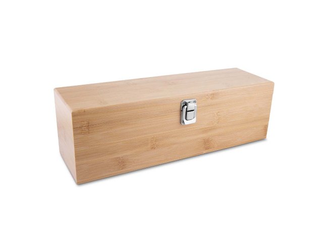 Kit Vinho em bambu com interior em EVA e fecho em inox, suporte para garrafa de vinho de 750 ml (padrão). Contém: saca-rolha de metal com detalhes em bambu e cortador de lacre, anel corta-gotas de metal, bico para servir de metal com tampa em bambu e tampa de metal com detalhe em bambu.