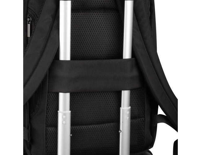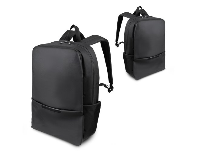Mochila para notebook em tecido poliéster 600D e detalhe em PU, compartimento interno para notebook de até 15,6", engate para mala de viagem, dois bolsos laterais e bolso frontal com zíper.
