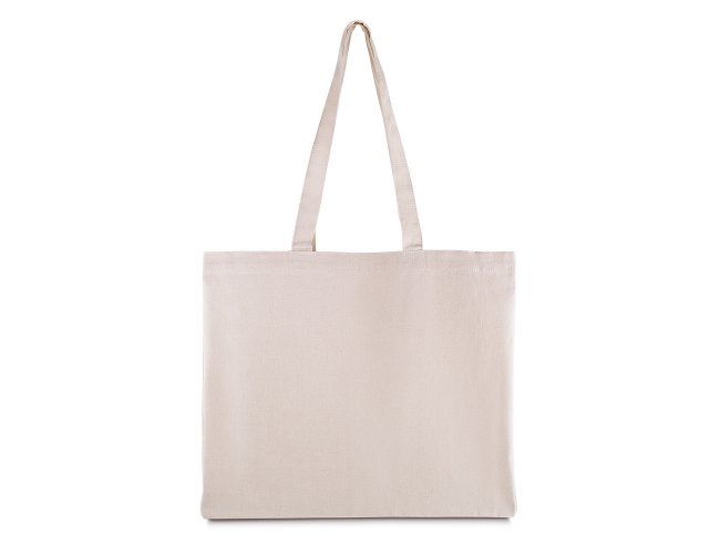 Sacola em Algodão Cru 200g/m² com base plana. Alça com altura de 31 cm, ideal para transporte.
